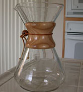 Mr. Coffee, Bunn, Melitta, etc. We all know these devices all too well. When calibrated to the right temperature (as Bunn is known to do) the coffee is very good. Coffee grounds, a medium grind, are placed in a basket with a filter. Hot water drips into the basket, over the grounds, through the filter and into the carafe. Most paper filters actually are part of the problem and can be replaced by a gold mesh filter, which, if properly cleaned, works very well. An auto drip system can make a wonderful cup of coffee, too often it does not. |