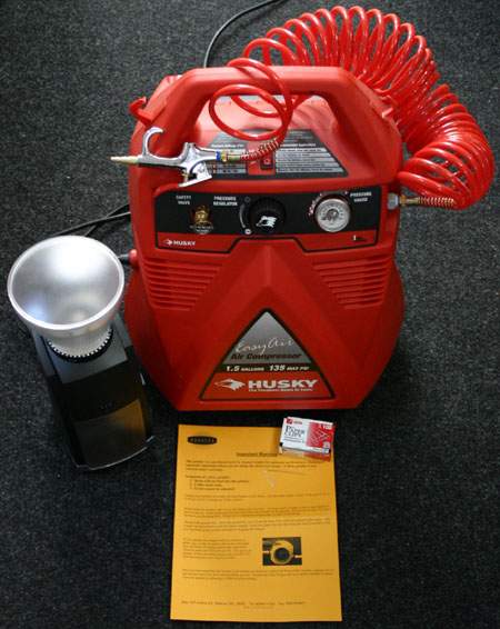 Being dedicated to coffee, I went to Home Depot and bought an air compressor. Really. This was $99 and looked like it could do the job. |